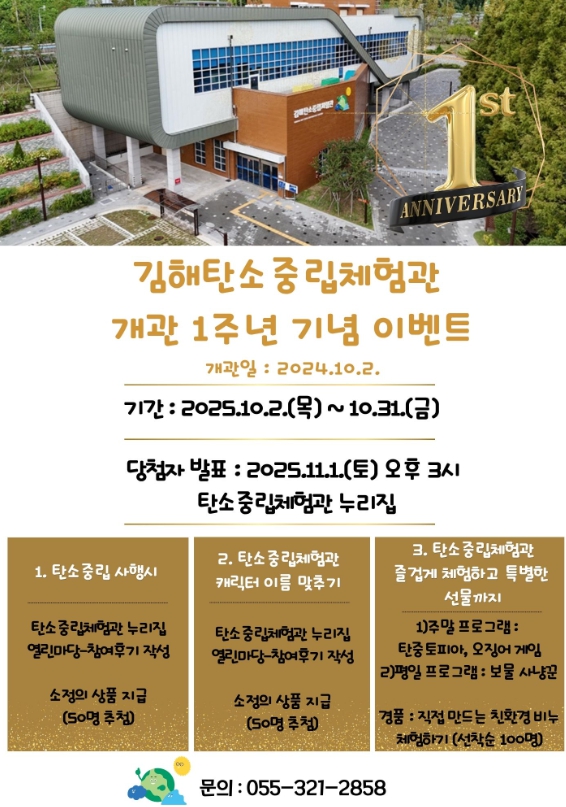 [뉴스다컴] 김해시는 김해탄소중립체험관 개관 1주년을 맞아 2일부터 31일까지 한 달간 특별 기념 이벤트를 운영한다. 이번 이벤트는 온라인과 오프라인 어디든 자유롭게 참여할 수 있다.