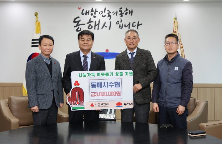 [뉴스다컴] 동해시수산업협동조합(조합장 김동진)은 지난 11월 김장김치 기탁에 이어 다시한번 지역사회 나눔에 희망2026나눔캠페인에 동참하며 이웃돕기 성금 300만원을 동해시에 기탁했다.