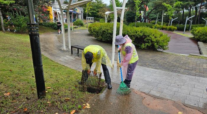 ▲ 지난 25일 공원녹지관리 작업단이 신대 중앙공원 내 배수로 준설작업을 하고 있다 |