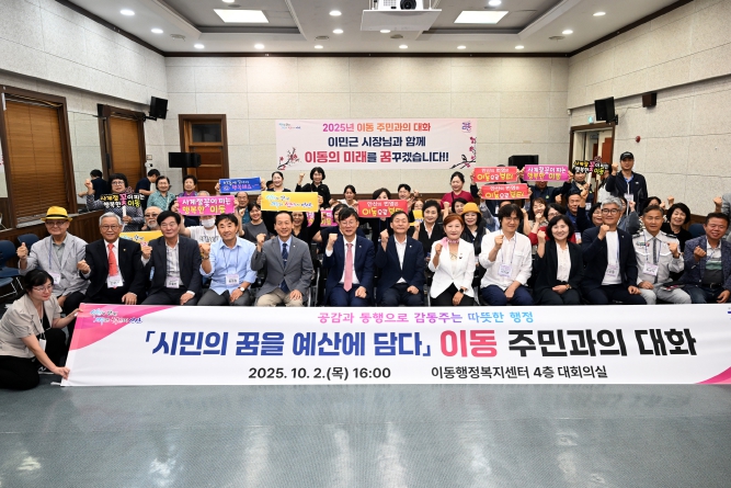 행사는 ▲시장 인사와 시정 운영계획 공유 ▲이동 지역 현황 설명 ▲주민 건의사항 청취 및 답변 ▲현장 방문 순으로 진행됐다. 이 시장은 주민들에게 시의 정책 방향과 이동 지역 발전 비전을 직접 설명하며 소통의 폭을 넓혔다. 이어 주민들의 질의와 건의에 적극 답변한 뒤, ‘현답버스’를 타고 주민들과 함께 이동 완충녹지 민원 현장을 방문해 개선 방안을 논의했다.