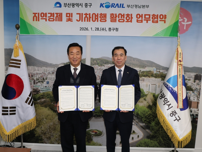 [뉴스다컴] 부산 중구는 28일 코레일 부산경남본부와 ‘지역경제 및 기차여행 활성화 업무협약’을 체결했다.