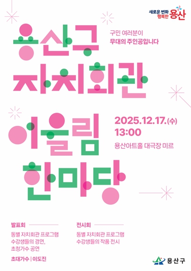 [뉴스다컴] 서울 용산구가 17일 용산아트홀 대극장 미르에서 한 해 동안의 자치회관 운영 성과를 공유하고 주민 화합을 도모하는 ‘2025년 자치회관 어울림한마당’을 개최한다.