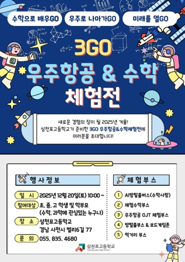 [뉴스다컴] 삼천포고등학교는 오는 12월 20일 오전 10시부터 교내에서 ‘3GO 우주항공&수학 체험전’을 개최한다.