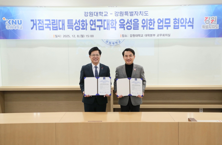 [뉴스다컴] 강원특별자치도는 12월 8일 강원대학교 대학본부 3층 교무회의실에서 강원대학교와'거점국립대 특성화 연구대학 육성을 위한 업무협약'을 체결했다고 밝혔다.