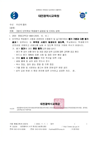 [뉴스다컴] 대전시교육청은 11월 7일 단위학교의 수행평가 및 실기평가 관련 공정성을 강화하도록 전 학교에 긴급 안내했다고 밝혔다.