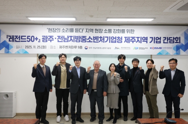 25일 개최된 간담회에는 광주전남중기청, 제주특별자치도, 제주TP 등 주요 관계기관과 레비레스코(대표 박성주), 건풍바이오(대표 오천금) 등 레전드50+ 참여기업 임직원들이 참석했다.