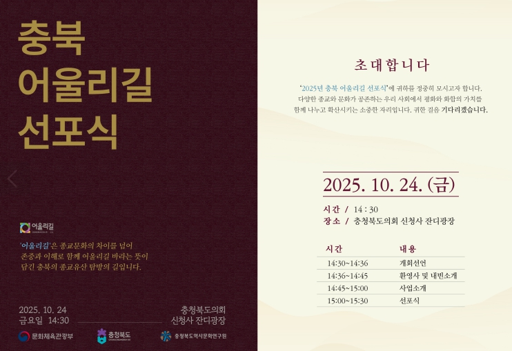 충북도는 지난 5월 문화체육관광부 공모사업인 ‘2025 종교평화 문화프로그램’에 선정된 이후, 4개 종단이 참여하는 추진협의체를 구성하여 프로그램 개발과 운영을 위해 종교계와 협력을 이어왔다.