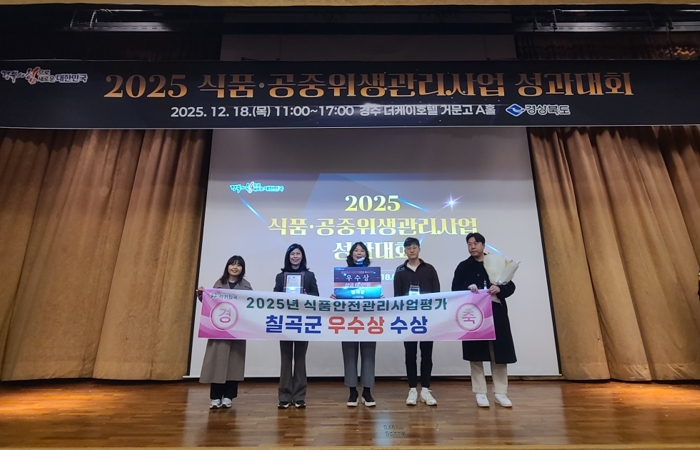 [뉴스다컴] 칠곡군은 18일 경상북도가 주관한 '2025년 식품위생관리 시·군 종합평가'에서 ‘우수상’을 수상하는 영예를 안았다.