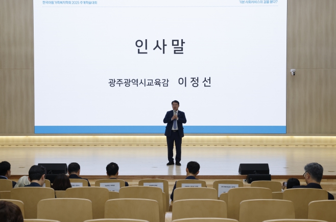 | ▲ 이정선 광주시교육감이 24일 전남대 컨벤션센터에서 진행한 ‘2025 한국아동가족복지학회 추계학술대회’에서 인사말을 하고 있다. / 광주시교육청 제공 |