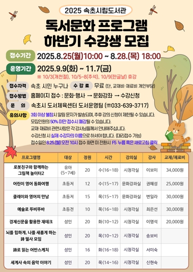 | ▲ 속초시립도서관, 2025년 하반기 독서문화프로그램 수강생 모집 |