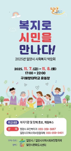 [뉴스다컴] 경남 밀양시는 오는 7일부터 8일까지 이틀간 구 밀양대학교 운동장에서 ‘복지로 시민을 만나다!’를 주제로 ‘2025년 밀양시 사회복지박람회’를 개최한다고 4일 밝혔다.