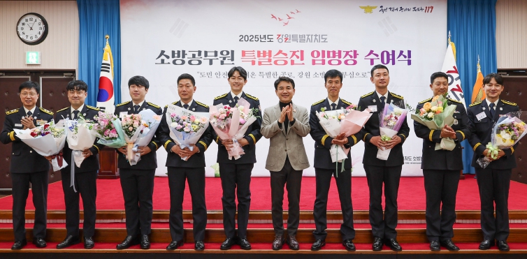 [뉴스다컴] 강원특별자치도는 12월 3일 도청 신관 대회의실에서 도민의 생명과 안전을 지키는 데 헌신한 우수 소방공무원 8명에 대해 특별승진 임용장 수여식을 개최했다고 밝혔다.