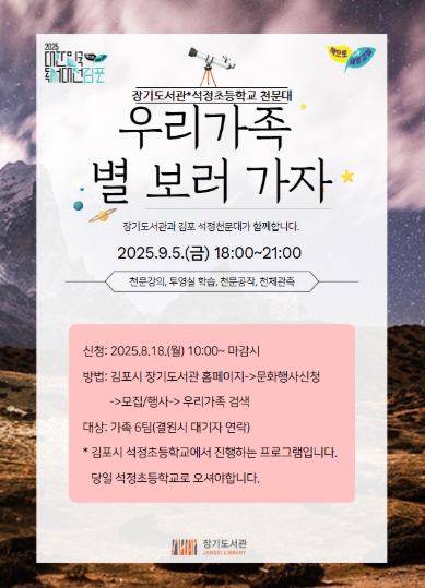 [뉴스다컴] 김포시 장기도서관이 2025년 대한민국 독서대전 천체관측 프로그램으로 '우리가족 별 보러 가자'을 오는 9월 5일 오후 6시부터 9시까지 김포시 석정초등학교에서 운영한다.