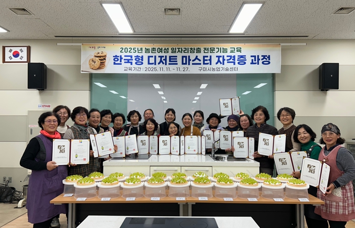 [뉴스다컴] 구미시는 농촌여성의 경제활동 참여 확대와 일자리 창출을 목표로 올해 상·하반기 전문기능교육을 운영해 ‘노인실버건강지도사’와 ‘한국형 디저트 마스터’ 2개 자격증 과정을 성공적으로 마무리했다.
