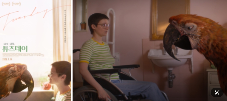 '튜즈데이'는 죽음을 배웅하는 특별한 존재 앵무새 ‘죽음’과 죽음이 다가온 10대 소녀 ‘튜즈데이’의 이야기를 담아내며 A24의 독창적인 세계관을 보여준다.