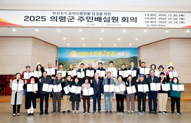 오태완 군수는 “주민배심원 회의는 군민과의 약속인 공약 이행을 군민과 함께 점검하고 발전 방향을 모색하는 뜻깊은 자리”라며 “군민이 직접 참여하는 군정 운영을 통해 신뢰받는 의령군을 만들어 가겠다”고 밝혔다.