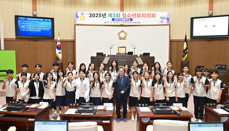 [뉴스다컴] 진주시의회는 24일 본회의장에서 선인국제중학교 학생 31명이 참여한 가운데 ‘2025년 제3회 청소년 모의의회’를 개최했다.