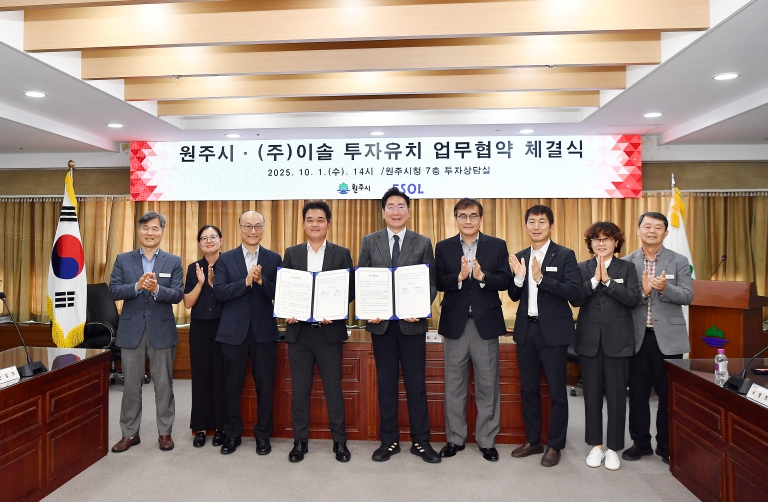[뉴스다컴] 원주시는 10월 1일 오후 2시, 시청 7층 투자상담실에서 ㈜이솔(대표 김병국)과 투자유치 협약(MOU)을 체결했다. 이번 협약은 총 505억 원 규모의 투자로, 부론일반산업단지에 소형 방사광가속기와 첨단 EUV 반도체 검사장비 연구·생산시설을 구축하는 사업이다. EUV(Extreme Ultra-Violet)는 반도체 초미세 공정(7nm 이하)에 필수적인 광원이다.