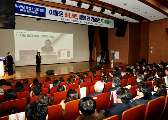 [뉴스다컴] 광주광역시는 2일 빛고을노인건강타운에서 ‘광주전남 통합 복지·보건·의료 분야 시민공청회’를 개최, 광주전남 통합으로 광주가 시작한 통합돌봄 등을 더 두텁게 보장할 수 있는 방안 등을 논의했다.