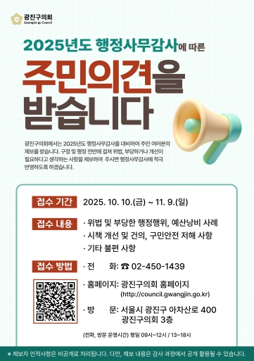 [뉴스다컴] 광진구의회가 오는 11월 17일부터 진행되는 ‘2025년도 행정사무감사’를 앞두고 주민 의견을 10월 10일부터 11월 9일까지 총 31일간 접수한다.