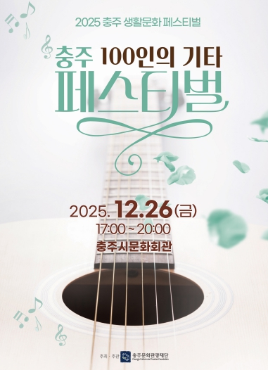 [뉴스다컴] (재)충주문화관광재단은 오는 12월 26일 충주시문화회관에서‘충주 100인의 기타 페스티벌’을 개최한다고 밝혔다. 이번 페스티벌은 충주 지역의 기타동아리들이 한자리에 모여 기타의 아름다운 선율을 시민들에게 선보이는 자리로, 통기타와 클래식기타를 모두 아우르는 공연 구성이 특징이다.