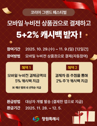 [뉴스다컴] 창원특례시는 오는 10월 29일부터 11월 9일까지 12일간, ‘코리아 그랜드 페스티벌’ 기간에 맞춰 모바일 창원사랑상품권 ‘누비전’ 결제 시 최대 7% 캐시백을 제공하는 특별 이벤트를 진행한다고 24일 밝혔다.