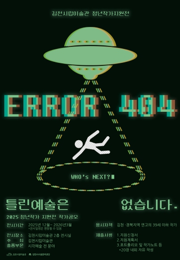 [뉴스다컴] 김천시시설관리공단이 운영하는 김천시립미술관은 지역 청년예술가의 창작 활동을 지원하고 예술적 성장을 돕기 위한 〈2025 청년작가 지원전 – ERROR 404 틀린 예술은 없습니다〉의 참여 작가를 모집한다고 밝혔다.
