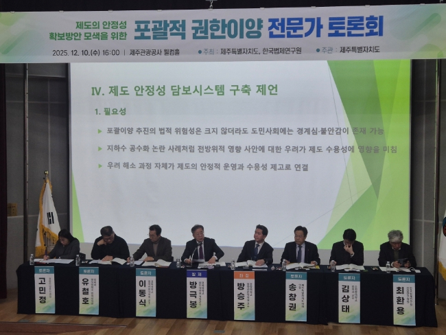 [뉴스다컴] 제주특별자치도가 포괄적 권한이양 제도의 실효성과 안정성 확보를 위해 전문가 토론회를 개최한 가운데, 전문가들은 제도의 법적 타당성을 확인하며 공청회 의무화·규제심사 강화 등 안정적 운영 방안을 구체화했다.