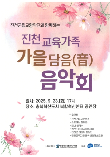 [뉴스다컴] 충청북도진천교육지원청은 오는 9월 23일 17시,충북혁신도시 복합혁신센터에서 '2025. 진천교육가족 가을담음(音) 음악회'를 개최한다.