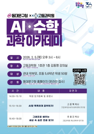 [뉴스다컴] 서울 동대문구가 겨울방학을 맞아 홍릉에 자리한 고등과학원(KIAS)과 손잡고 ‘AI·수학 과학아카데미’를 연다. 아이 혼자 ‘학원’으로 향하는 대신, 부모와 함께 강연장을 찾아 같은 내용을 듣고 집으로 돌아가는 길에 자연스럽게 대화를 이어가게 하는 ‘가족 소통형’ 프로그램이다.
