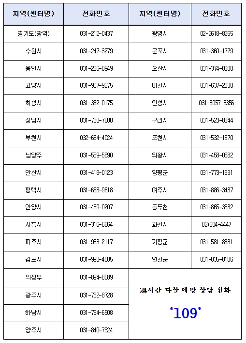 | ▲ 경기도내 자살예방센터 연락처 |