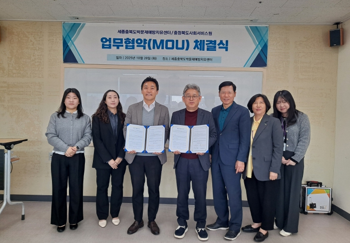 [뉴스다컴] 충청북도사회서비스원(원장 이장희)과 세종충북도박문제예방치유센터(센터장 김경진)는 2025년 10월 28일 오전 11시, 세종충북도박문제예방치유센터 회의실에서 도민의 정신건강 증진 및 삶의 질 향상과 사회서비스 협력체계 강화를 위한 업무협약(MOU)을 체결했다.