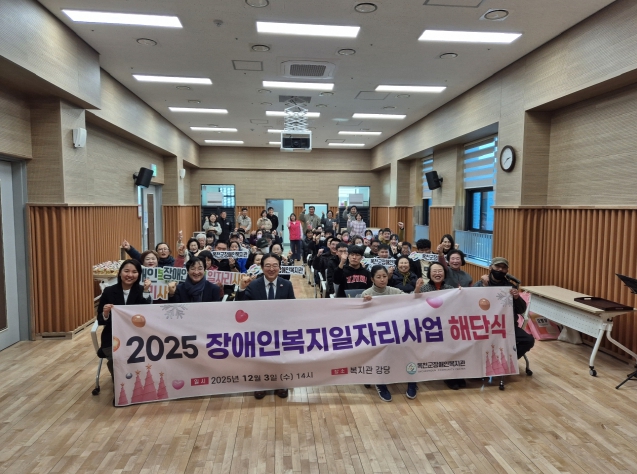 [뉴스다컴] 옥천군장애인복지관이 3일 일자리 참여자의 한 해 동안의 노고를 격려하고 근로 의욕을 높이기 위해 ‘2025년도 장애인복지일자리사업 해단식’을 개최했다.