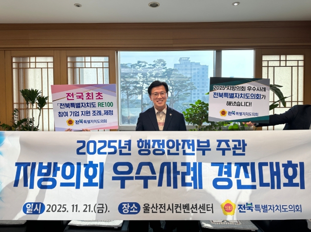 [뉴스다컴] 전북특별자치도의회가 지난 21일 울산전시컨벤션센터에서 열린 행정안전부 주관 ‘2025년 지방의회 우수사례 경진대회’에서 본선에 진출해 수상하는 영예를 안았다.