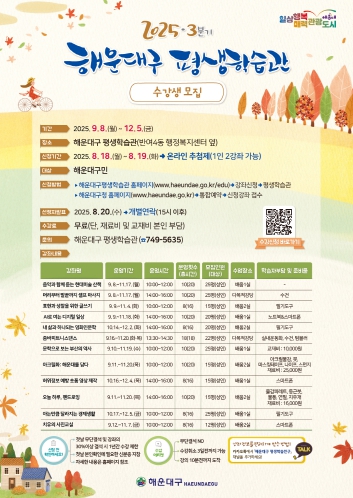 [뉴스다컴] 해운대구는 지역 주민을 위한 평생학습관 3분기 수강생을 모집한다. 3분기 강좌는 9월부터 12월까지 4개월간 운영된다.