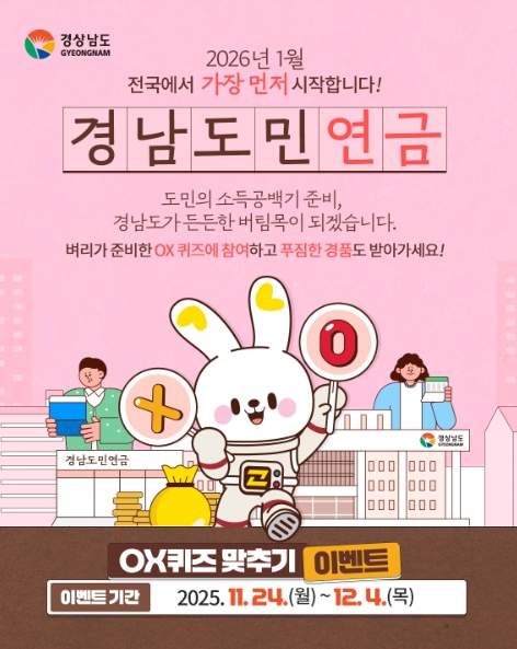 장수환 경상남도 홍보담당관은 “경남도민연금은 도민의 든든한 노후를 위한 새로운 안전망의 첫걸음”이라며, 이번 퀴즈를 통해 핵심 내용을 쉽고 재미있게 접하길 바란다”고 말했다. 이어 “퇴직 후 소득 공백기에 도민들이 안정적인 생활을 이어갈 수 있도록 경남도민연금에 많은 관심과 참여를 부탁드린다”고 덧붙였다.