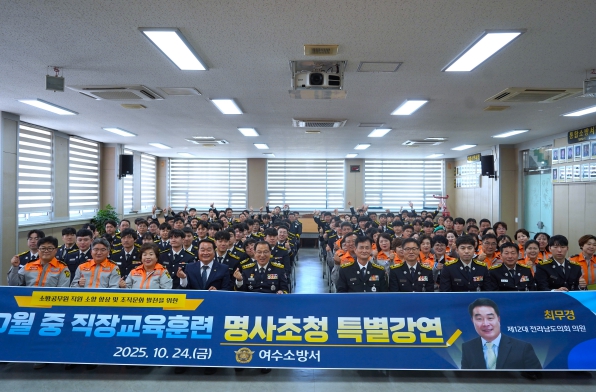 [뉴스다컴] 여수소방서(서장 서승호)는 10월 24일 본서에서 전 직원 및 의용소방대원을 대상으로 청렴·소통 강화 및 전기차 화재대응 특별교육, 명사 초청 공직자 교육을 실시했다.