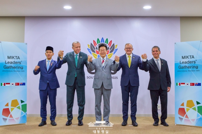 [뉴스다컴] 주요 20개국(G20) 정상회의 참석을 위해 남아프리카공화국을 방문한 이재명 대통령은22일(현지시간) 오후 우리나라, 멕시코, 인도네시아, 튀르키예, 호주 5개국으로 구성된 믹타(MIKTA) 회원국 정상들과 회동했다.