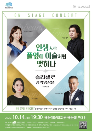 [뉴스다컴] 해운대문화회관은 10월 14일 해운홀에서 ‘온 스테이지 콘서트 솔라첼로 성악앙상블’을 개최한다.